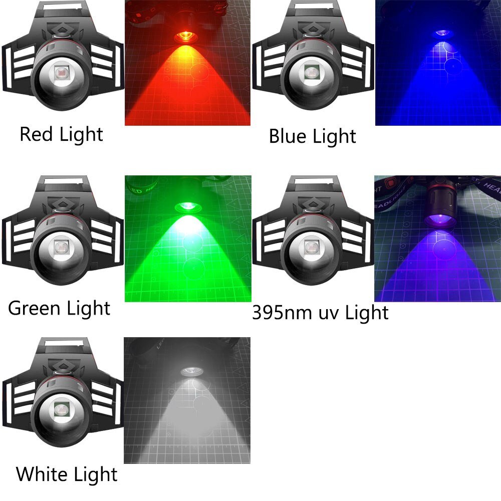 ZRE-LED XML-T6 LED Headlamp 3-Mode Zoomable Headlight 18650 Head Torch Fishing Light White Red Blue Green 395nm UV Hunting Flashlight