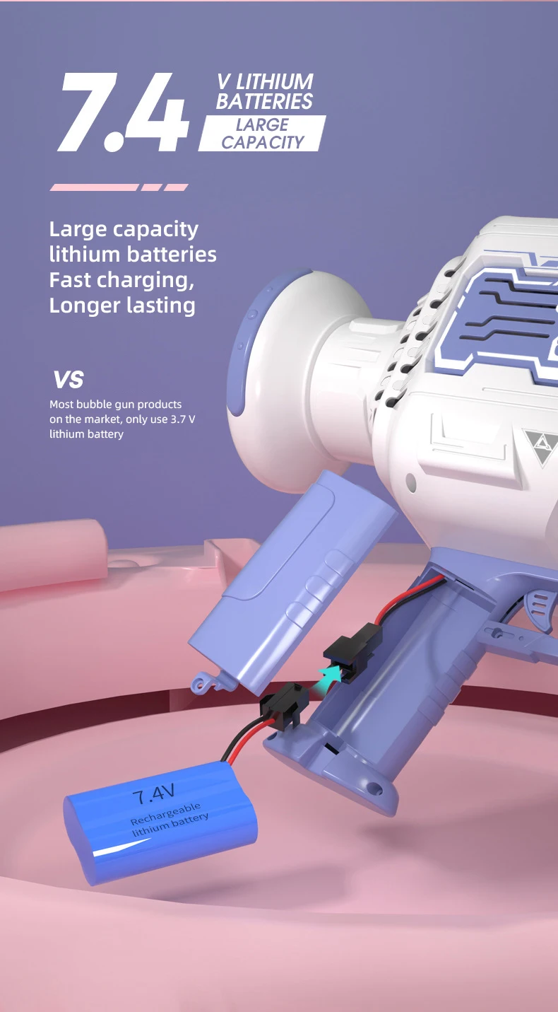 1. Powered by lithium battery: Interesting leaf blower that produces a stream of bubbles. With realistic design and fresh colors, this toy bubble blower is what you need. tap the bubble liquid and pull the trigger, a lot of bubbles will be ejected!