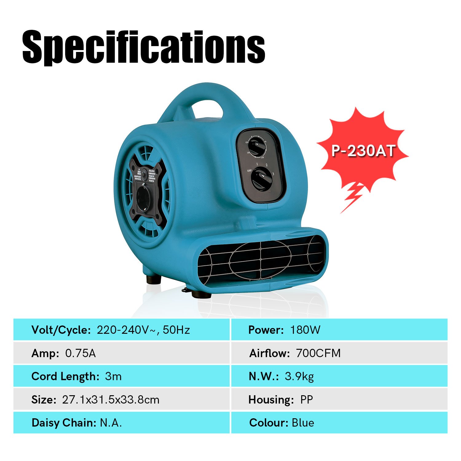 • Efficient:The P-80A is a powerful mini air blower that uses an energy efficient induction motor. This mini air mover is 29.21 x 23.6 x 31.2 cm and 3.58 kg. The 138W machine produces 600 Cubic feet per minute of airflow while only drawing a low 1.2 Amps.