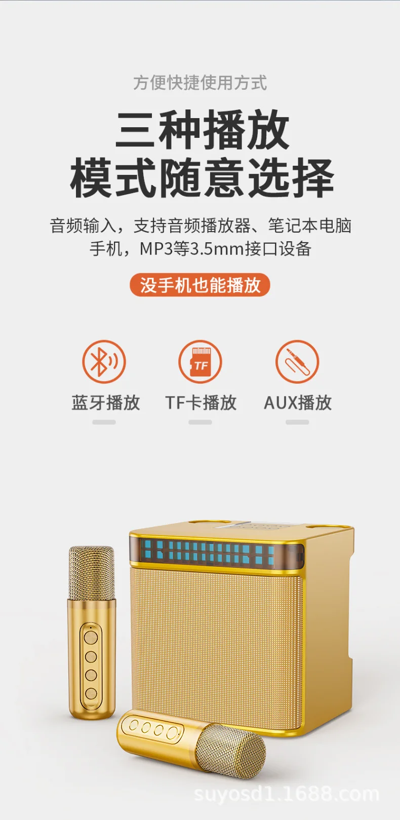 Package content:Â Bluetooth speaker, 2 microphones, charging cable, audio cable, certificate, Chinese and English instru