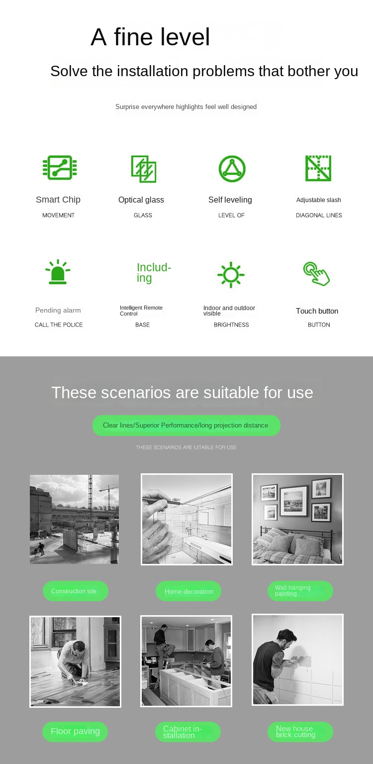 ● Indoor and outdoor general Universal, High brightness green, indoor and outdoor clearly, far projection distance, high laser height, clear lines.