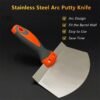 【Stainless Steel Putty Knife】Length: 9inch, Width: 7inch, Thickness: 2mm. Putty Knife is Anti-Corrosion, Anti-rust, Non-slip and wear-resistant Rubber Handle, Arc Design for easy pick up painting.