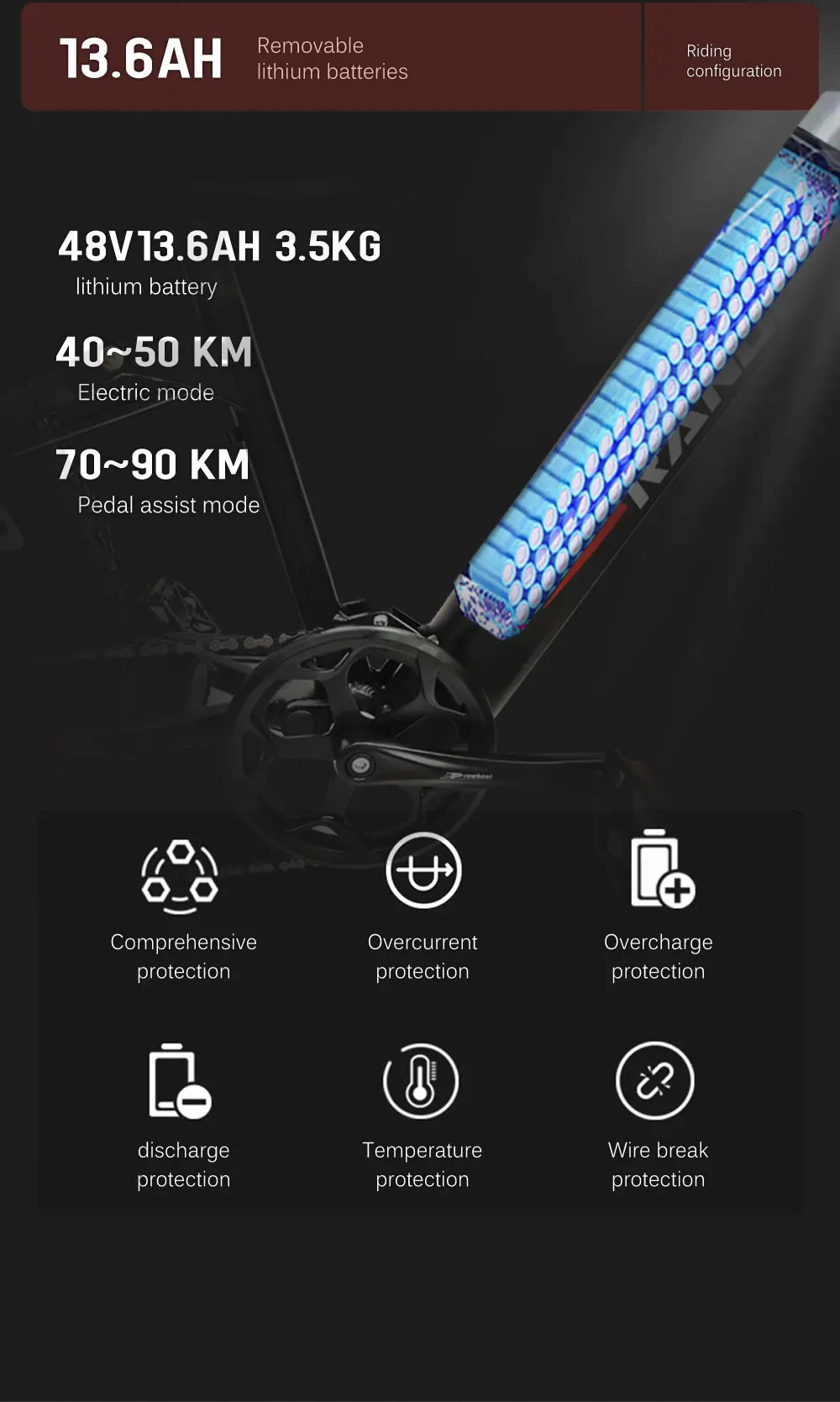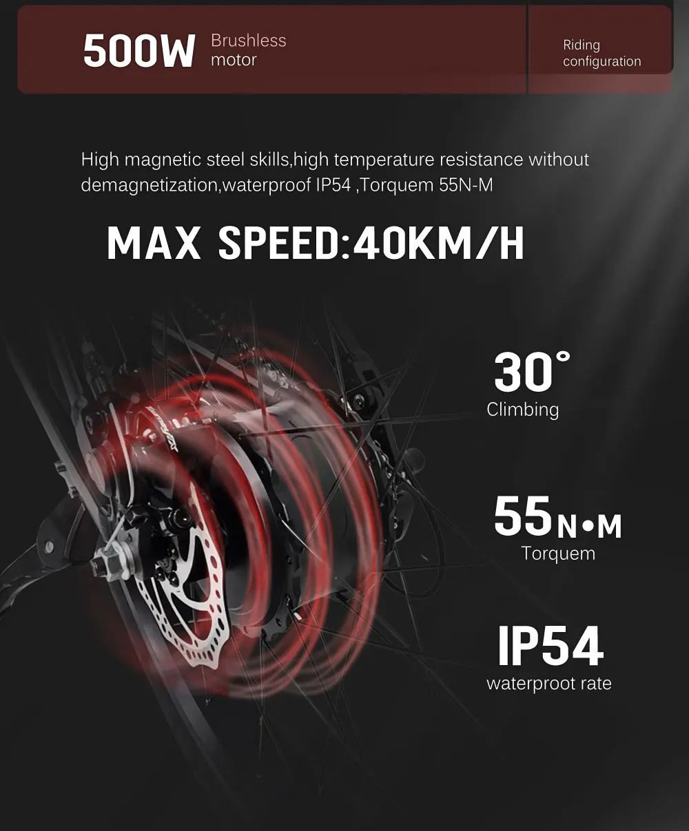 • Max speed: 40km/ h( Can set different speed limits. Lower speeds can be adjusted to comply with your local e-bike riding policy.)