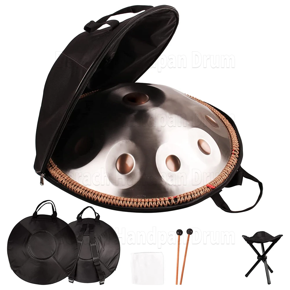 【Packing List】♬: 1 handpan drum, 1 drum bag, 2 drumsticks, 1 drum holder and 1 dust cloth. In the carrying case you can easily carry without breaking the drums. A complimentary cloth can help you clean your tambourine.