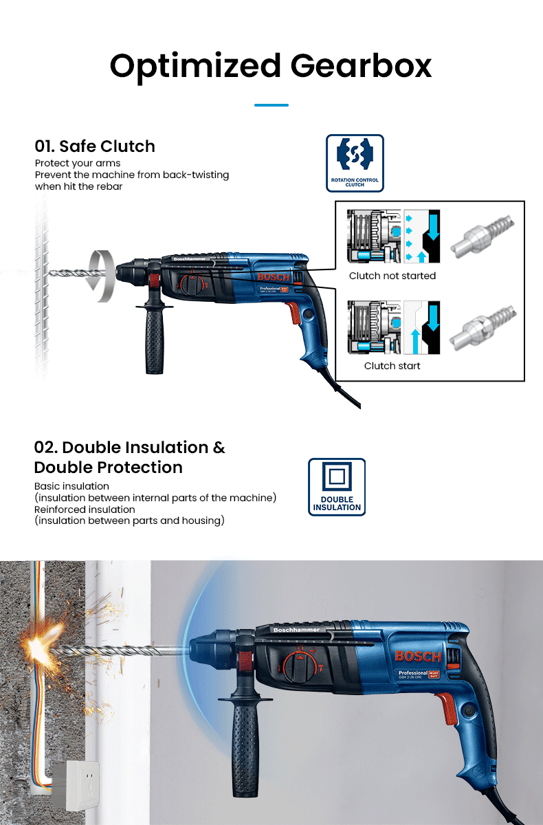 3. Rotation control safe clutch, prevent machine from back-twisting when hit the rebar, protect user’s arm