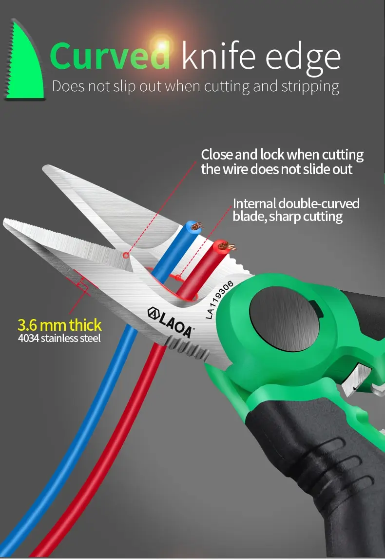 Curved knife edge, does not slip out when cutting and stripping