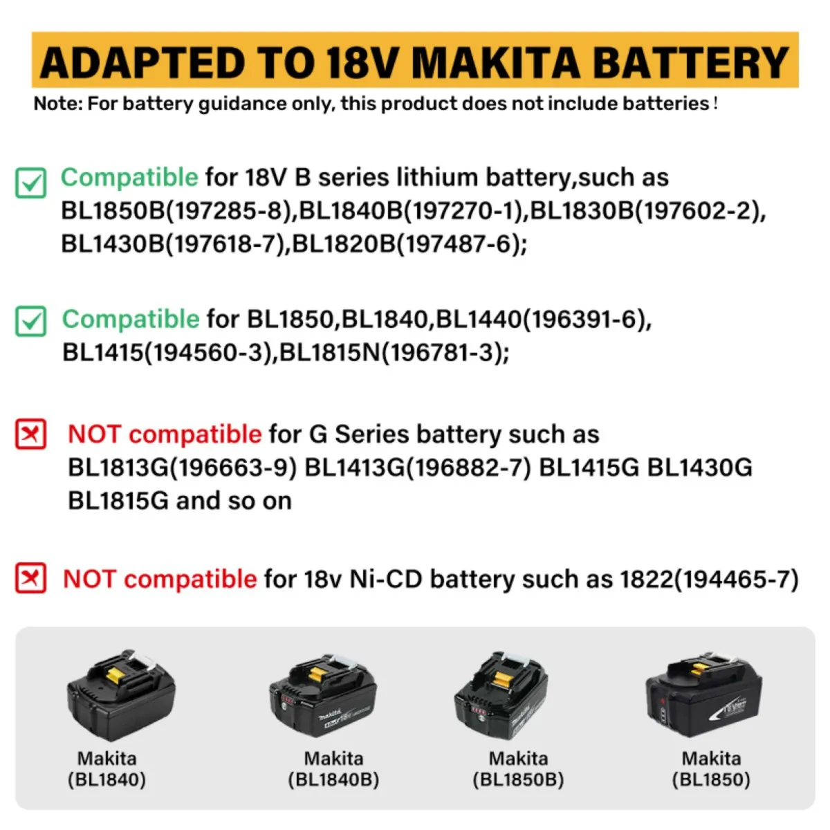 √ compatible for 18V B series lithium battery,such as BL1850B(197285-8),BL1840B(197270-1),BL1830B(197602-2),BL1430B(197618-7),BL1820B(197487-6);