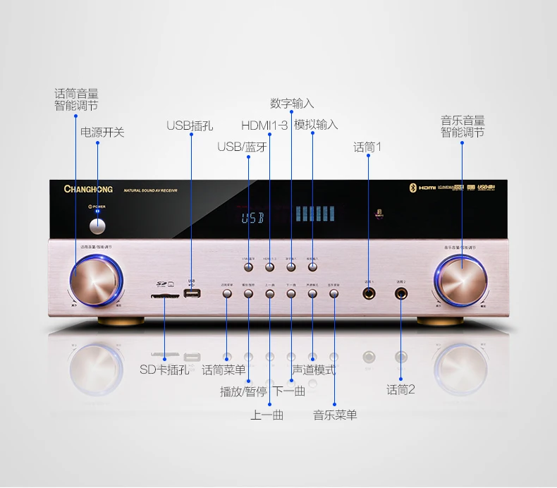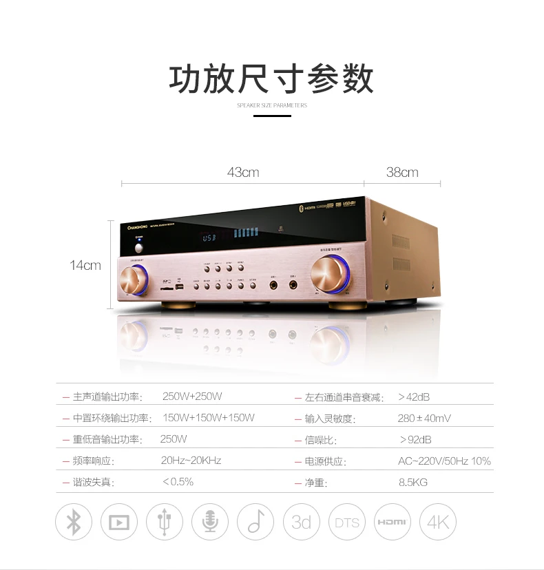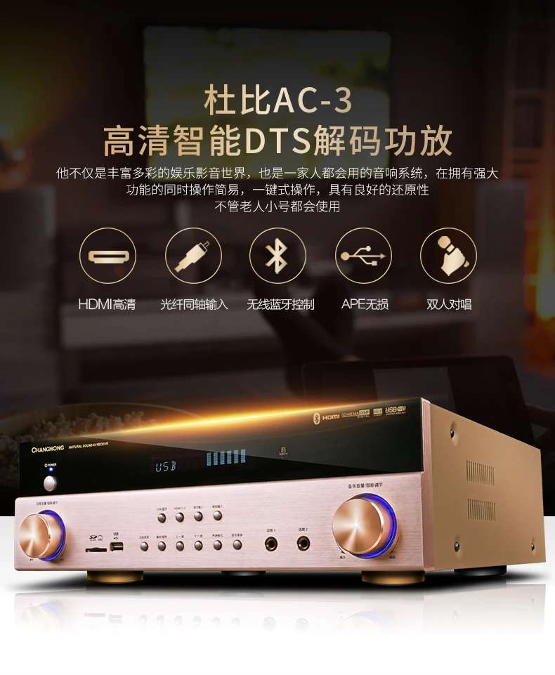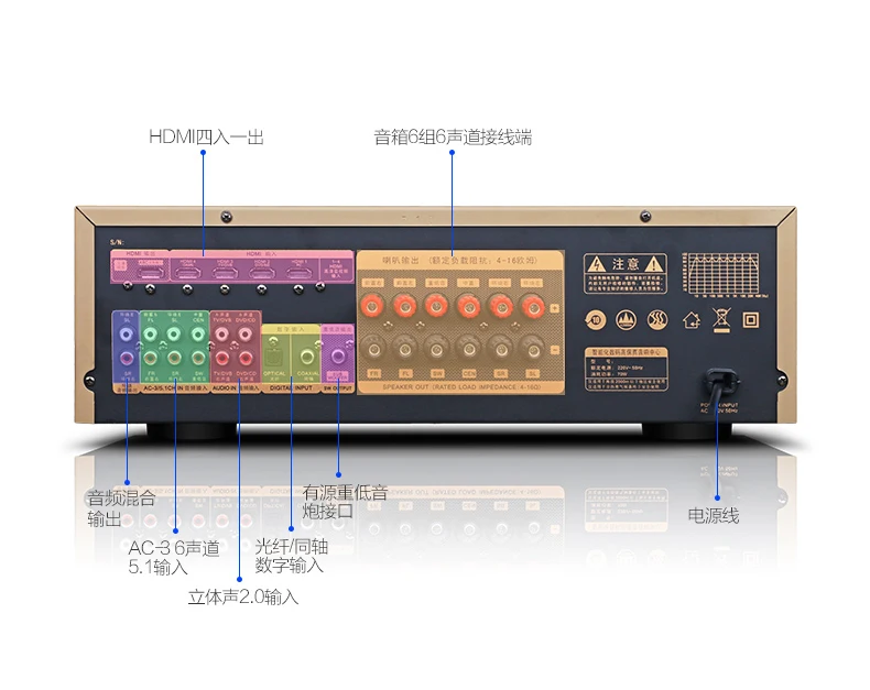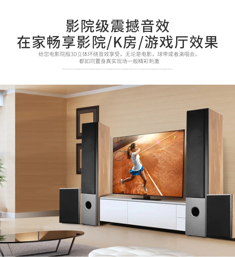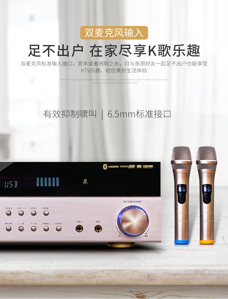 5.1 Power amplifier function support: Dolby DTS/AC-3 decoding/HDMI four-in-one-out/wireless bluetooth/optical coaxial/USB/TF card reading/multi-format decoding/dual microphone input/etc