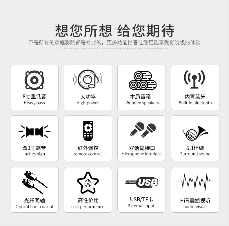 5.1 Power amplifier function support: Dolby DTS/AC-3 decoding/HDMI four-in-one-out/wireless bluetooth/optical coaxial/USB/TF card reading/multi-format decoding/dual microphone input/etc