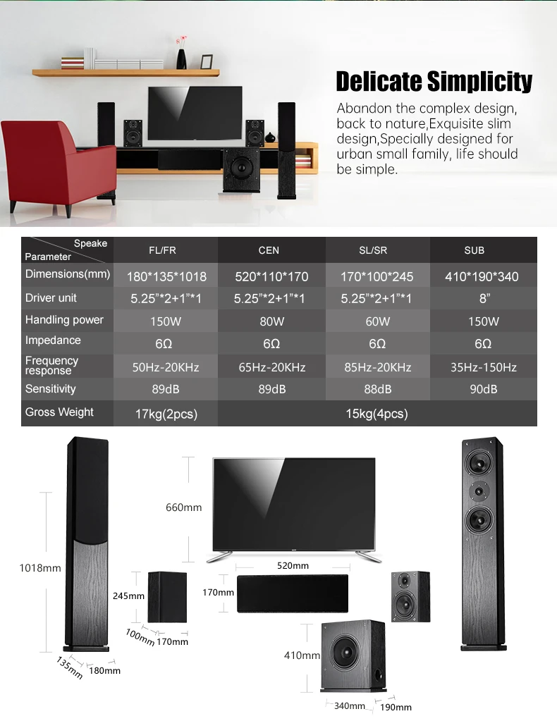 Surround Speaker: 5.25”*2+1”*1          Subwoofer Speaker: 8”*1