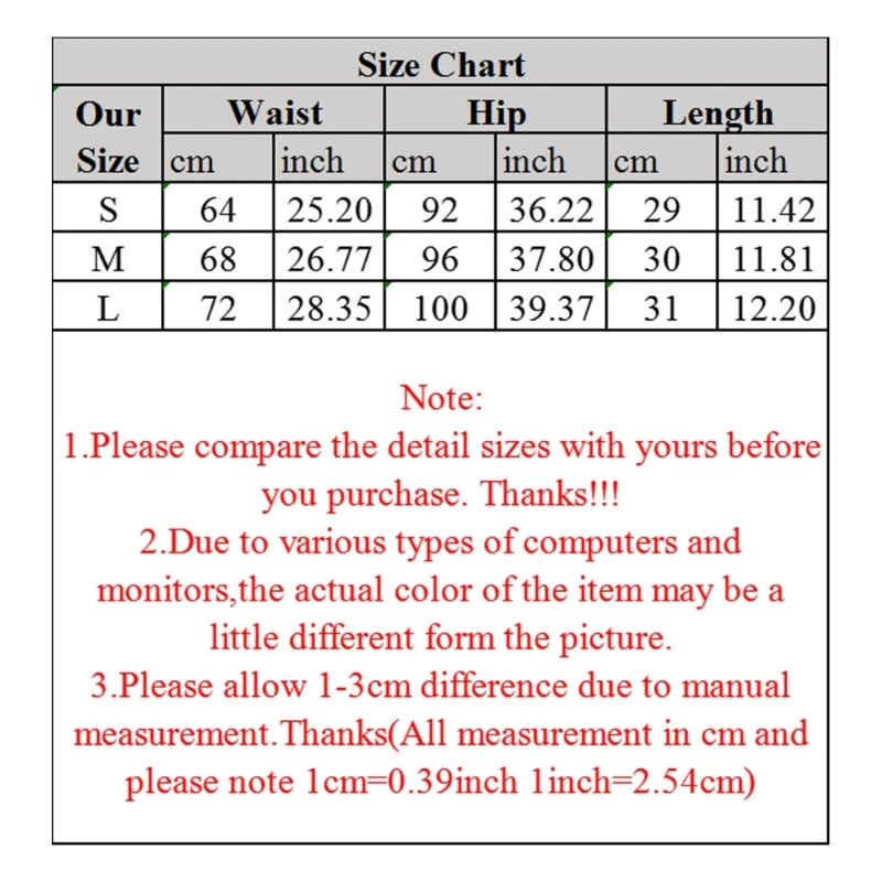 Size:LWaist:72cm(28.34inch)Hip:100cm(39.37inch)Length:31cm(12.20inch)