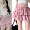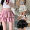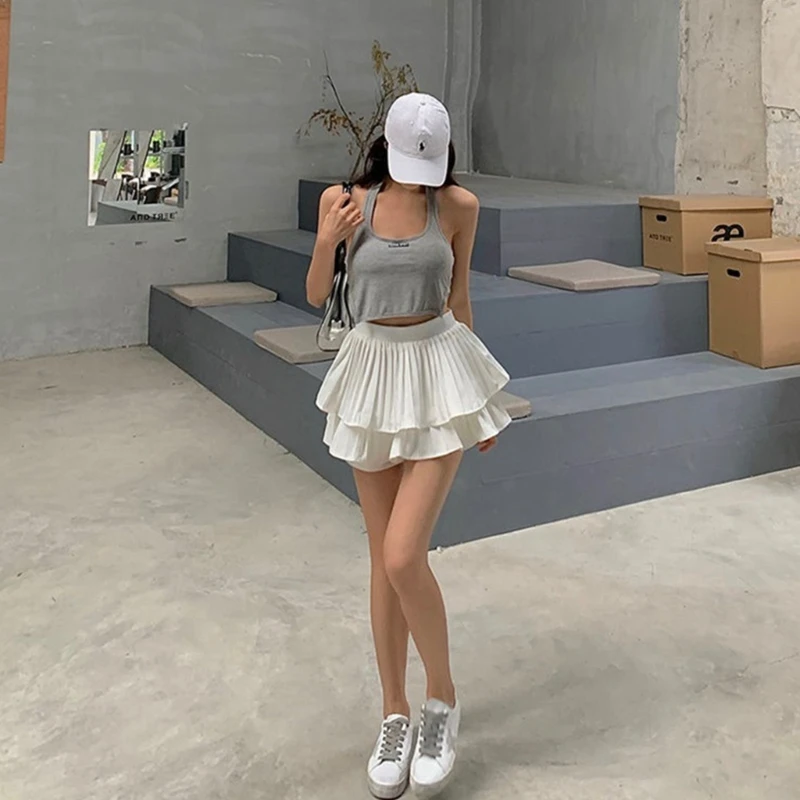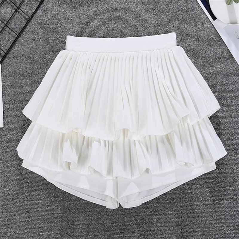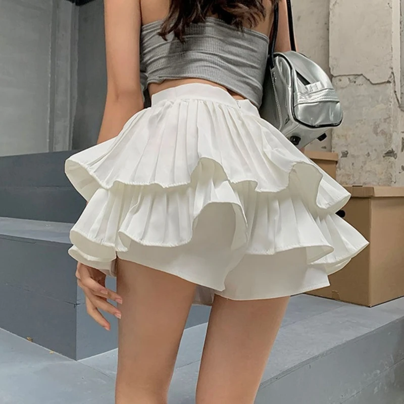 Double layer pleated ruffle hem, solid color, your legs look slimmer and longer.<br/>