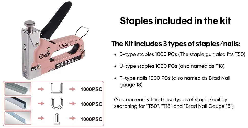 ❤ Size range of applicable staples – D type (T50): 3/16-9/16 inch; U type (T18): 3/8-1/2 inch; T type(Brad nail gauge 18): 3/8-9/16 inch;