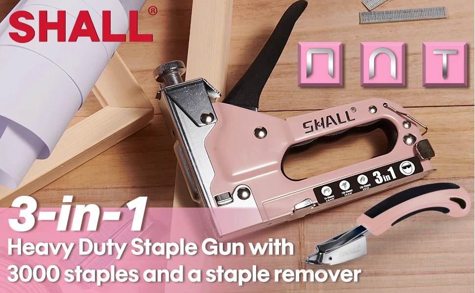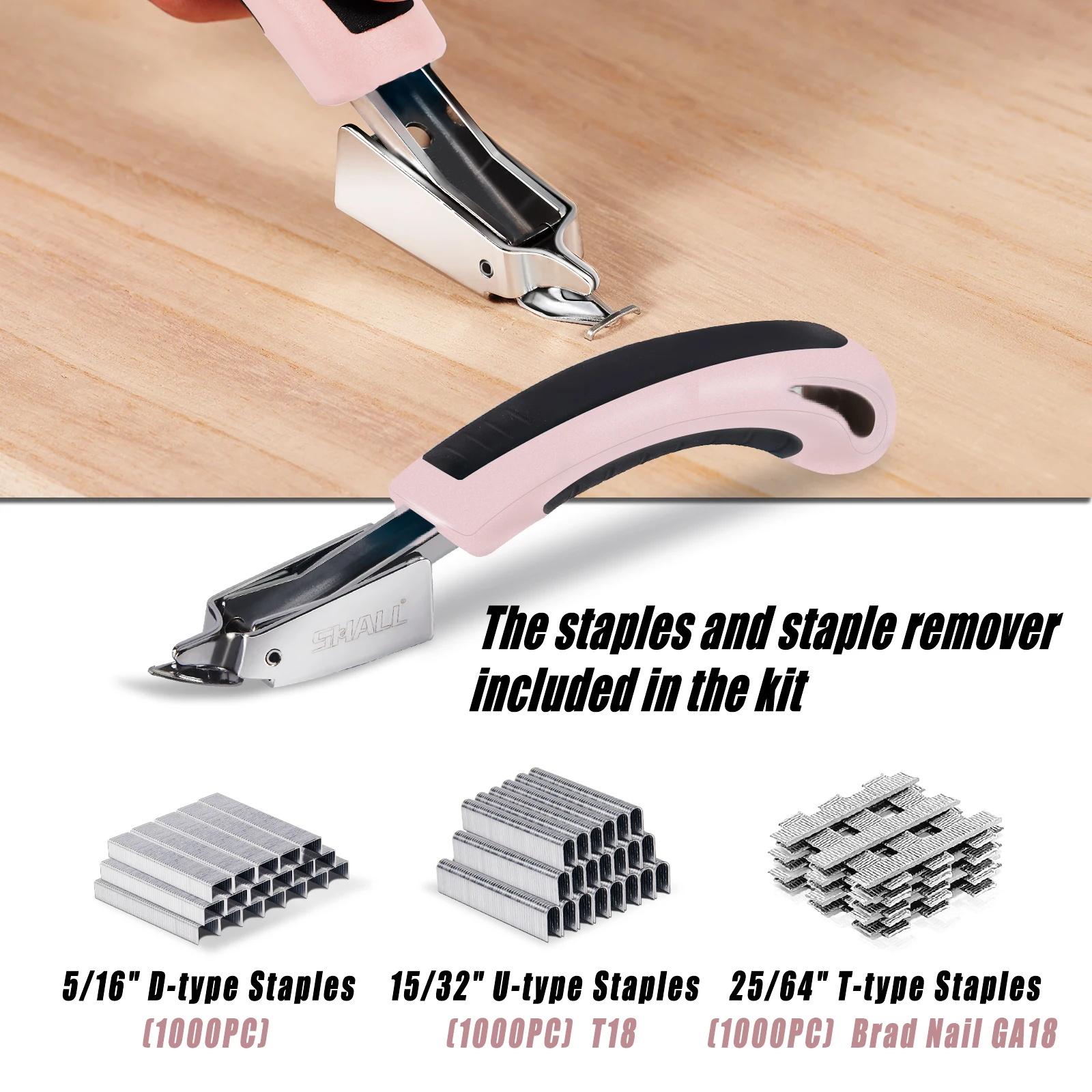 The set includes an all-metal 3-in-1 stapler gun, 3000PCs staples(1000 for each type) and a staples remover
