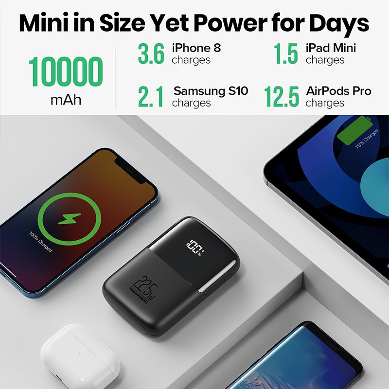 INIU PD 10000’s small size defies its enormous power. It refuels the new iPhone 13 2.2 times, Galaxy S10 2.1 times, iPad Mini 1.5 times or AirPods Pro 12.5 times.