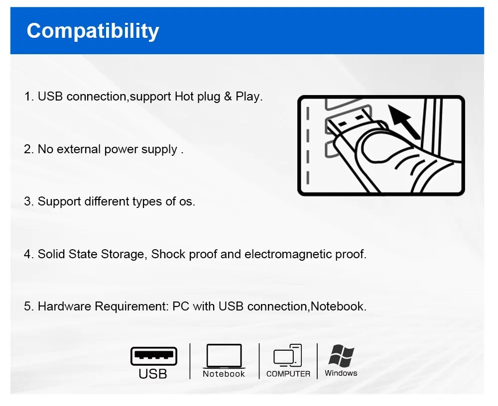 ●Easy to read and read in high speed ,No need drive/power supply only plug in.