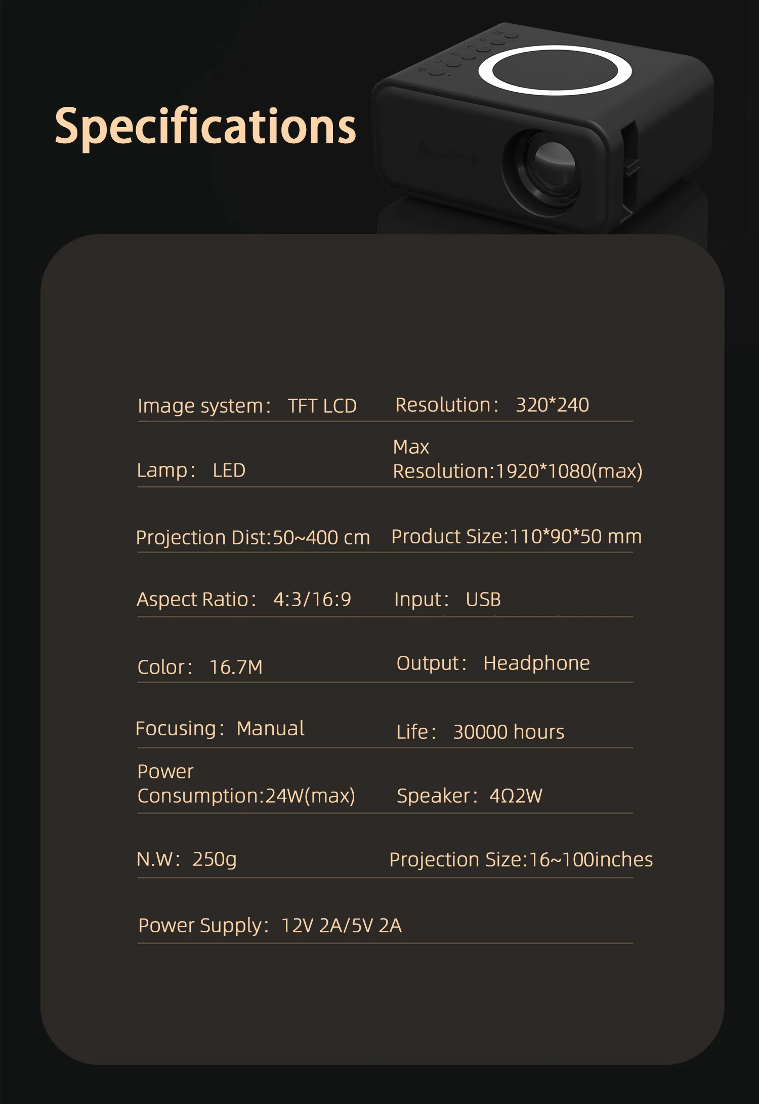 ZRE-AEPRJCTR YT300 Mini Projector MAX 1080P Small Size Big Screen WiFi Bulit in Speaker Portable Home Theater Support Miracast Airplay DLNA