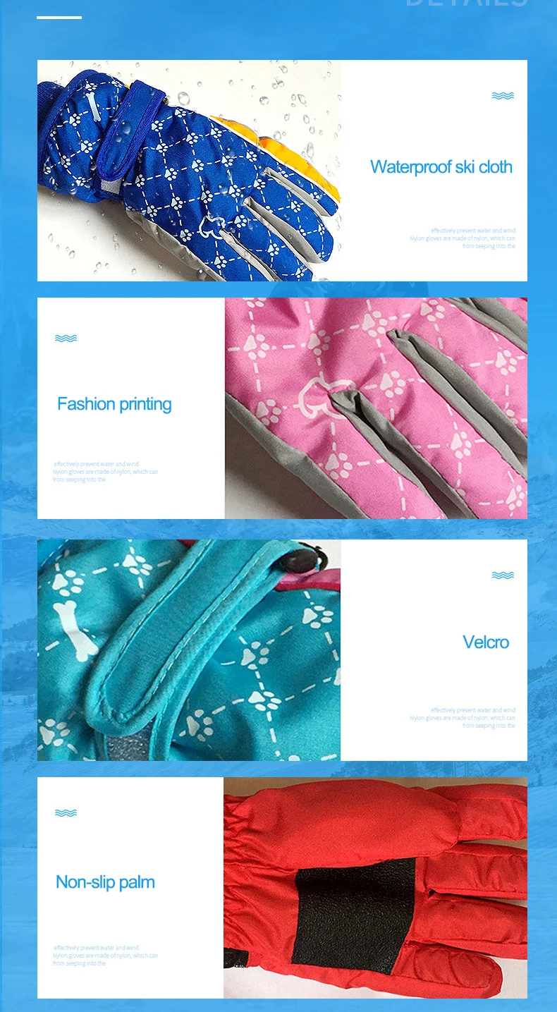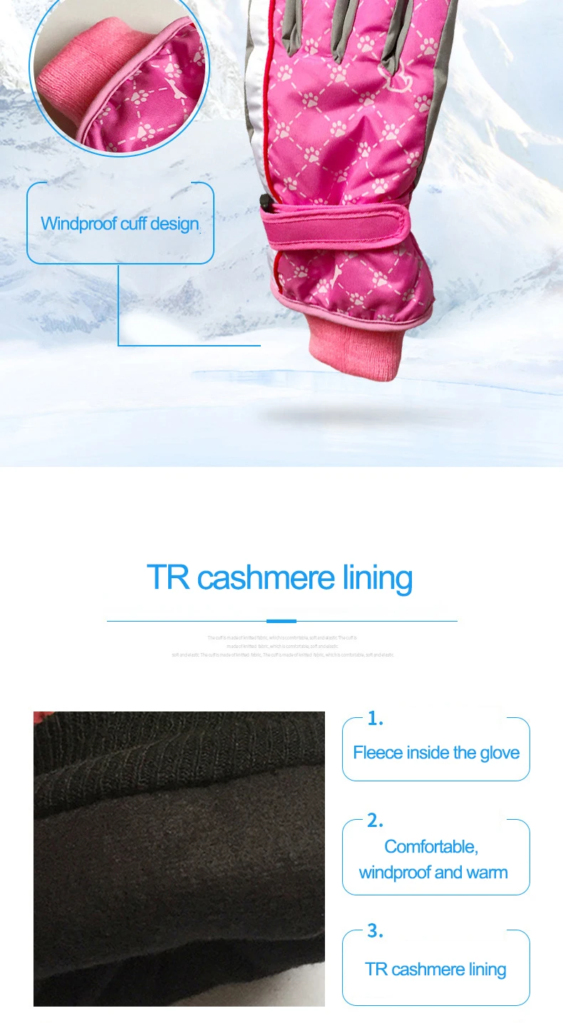 2. High quality material: children’s gloves are made of nylon, the second layer is filled with polyester fiber, and the thick velvet insulation is inside which keep the gloves windproof and waterproof.