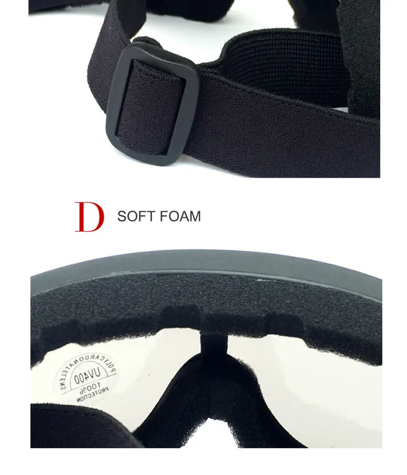 3.The thick soft sponge frame sits inside the goggle frame, so that there is no gaps between your eyes and goggles to keep away from the dust