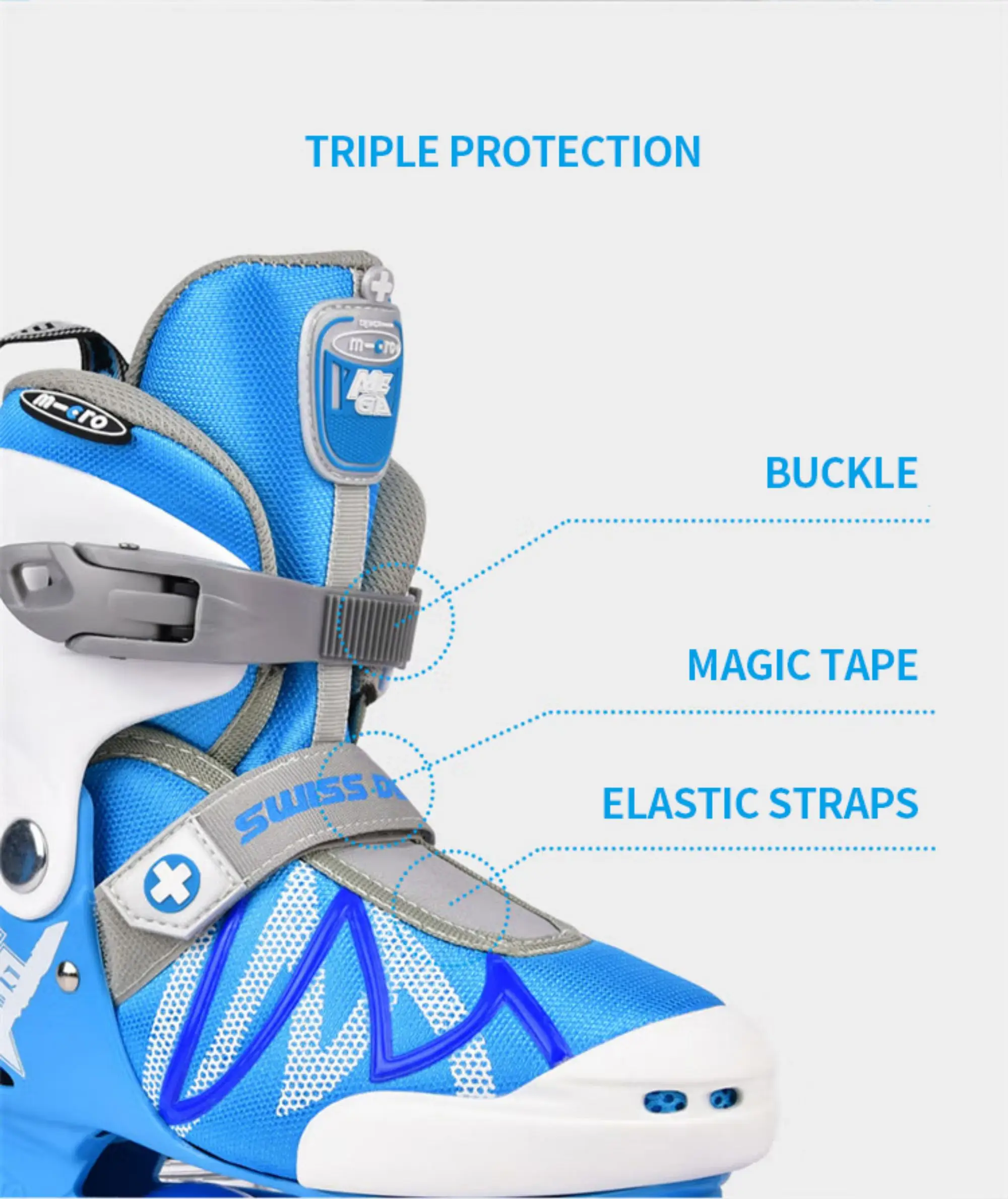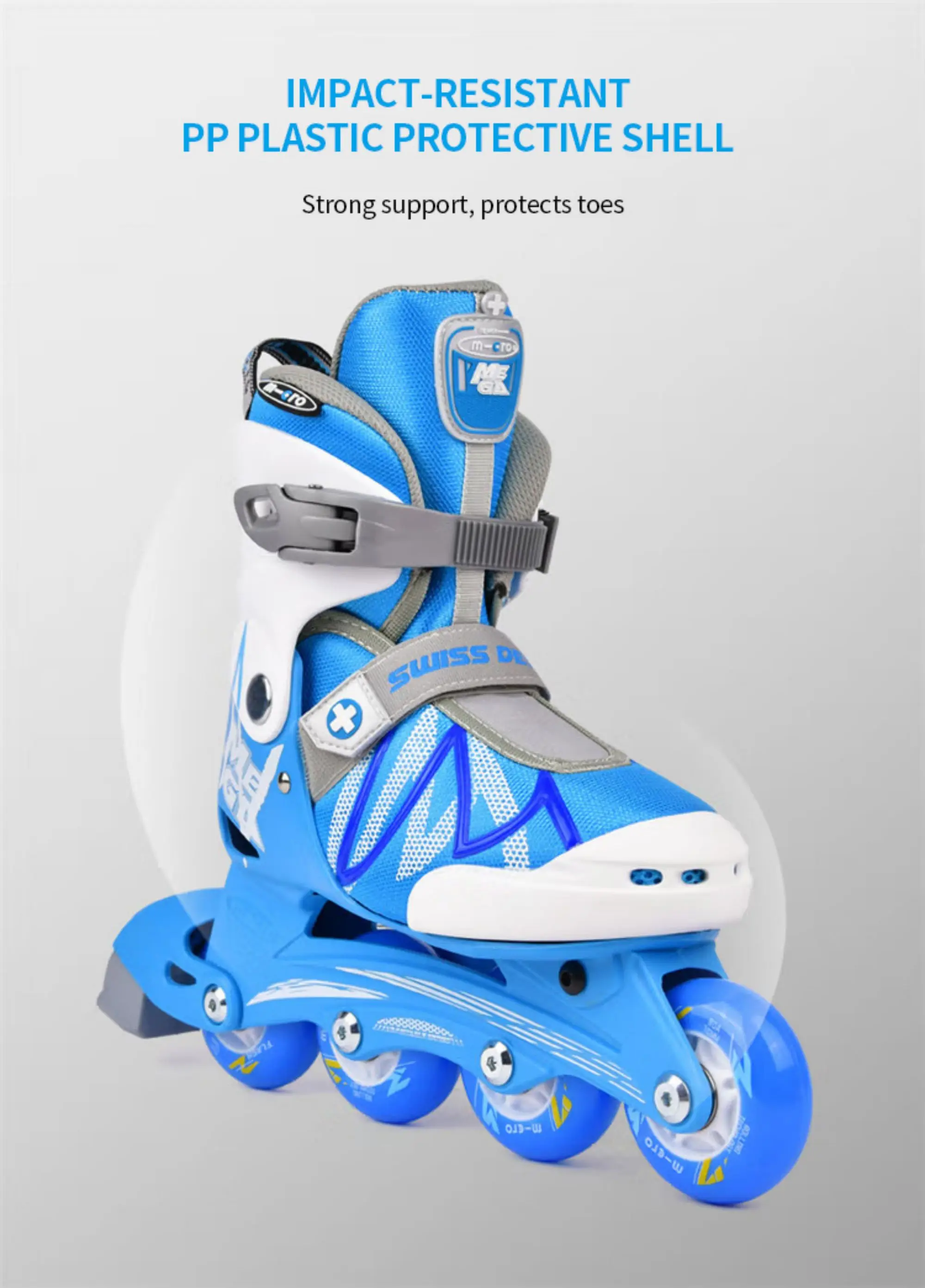 Equipped with an easy-to-use 4-size adjustable system, these skates offer long-term practicality and stability with triple-lock buckle straps and energy-efficient elastic bands plus high-strength PP protectors.