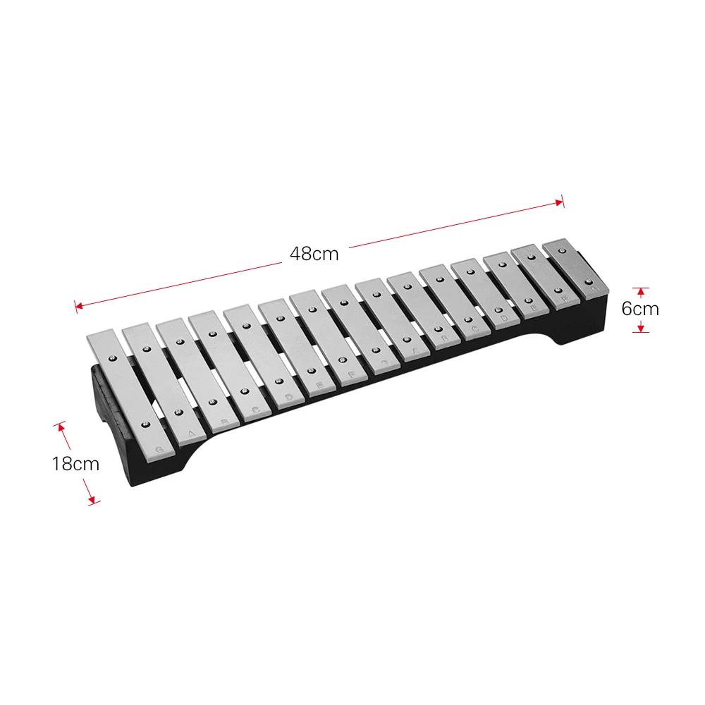 Large glockenspiel with 15 silver aluminum bars that can make 15 different notes, and the note names is already carved on the bars.