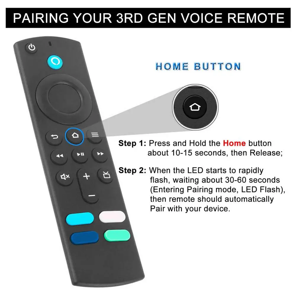 ⑤ Press the Home button and Hold about 10-15 seconds, Until the LED starts to rapidly flash then release, waiting about 30-60 seconds(Entering Pair mode, LED Flash), then the remote should automatically pair with your device.