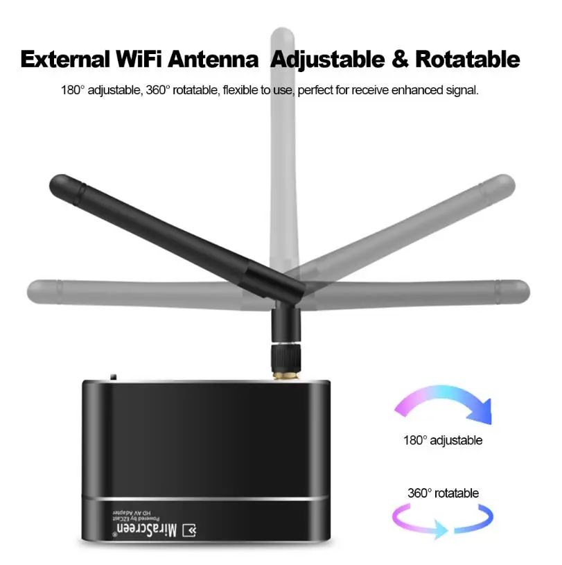 Rotatable WiFi antenna, supports 2.4GHz WiFi, strong signal, free to enjoy online and local content wireless display: Video, Audio, Photo, Office file.