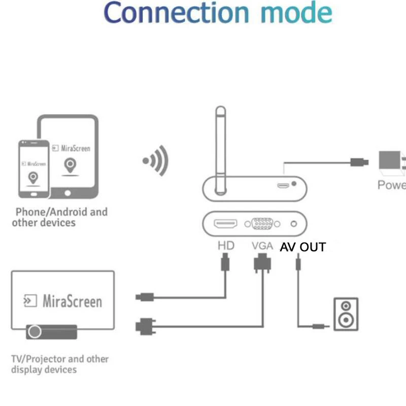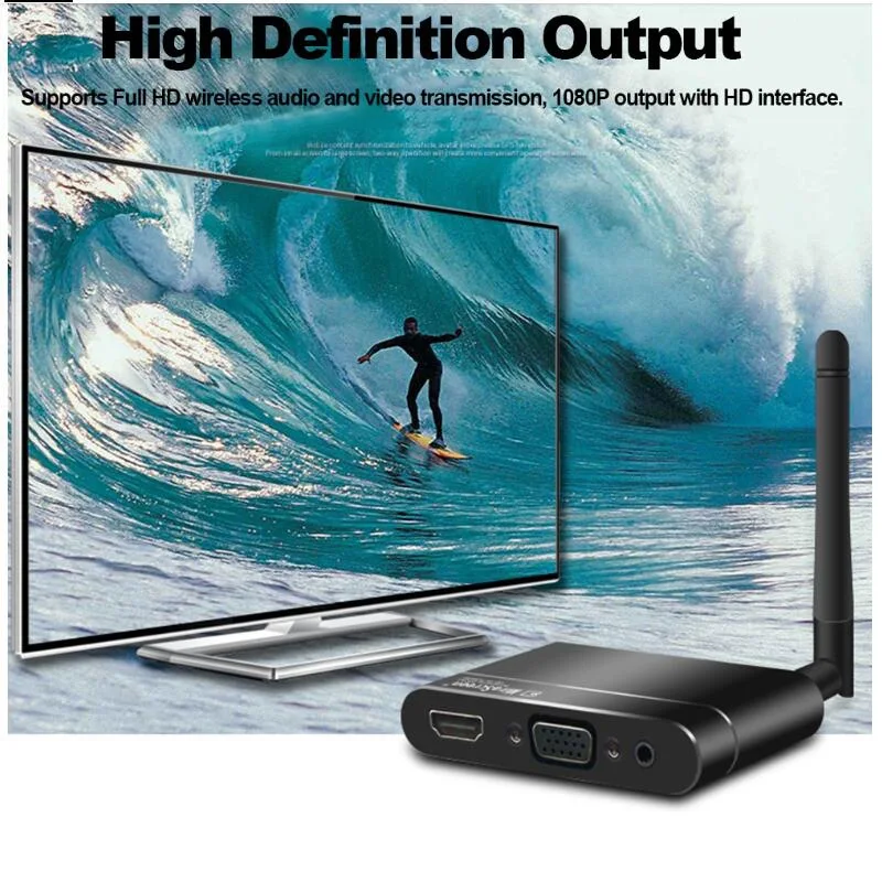 Supports Full HD wireless audio and video transmission, 1080P output with HD interface. With AV output, suitable for car display. Uses compact portable deign for easy carrying.