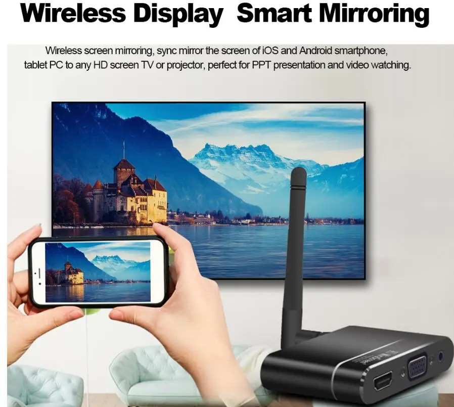 Wireless screen mirroring, sync mirror the screen of iOS and Android smartphone, tablet PC to any HD screen TV or projector, perfect for PPT presentation and video watching.
