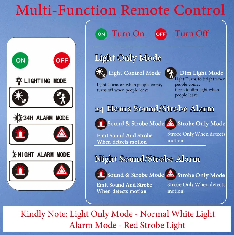 Function:Â 6 Models: #1 Normal night light, #2 Motion Sensor Night Light, #3 24 Hours-Sound And Strobe Alarm; #4 24 Hours-Silent Strobe Alarm; #5 Night 12 Hours-Sound And Strobe Alarm; #6 12 Hours-Silent Strobe Alarm