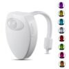 2.It offers 8 soft changeable colors for your nighttime bathroom, you can fix a single color with a button next to the sensor or let it automatically rotate through all the colours.