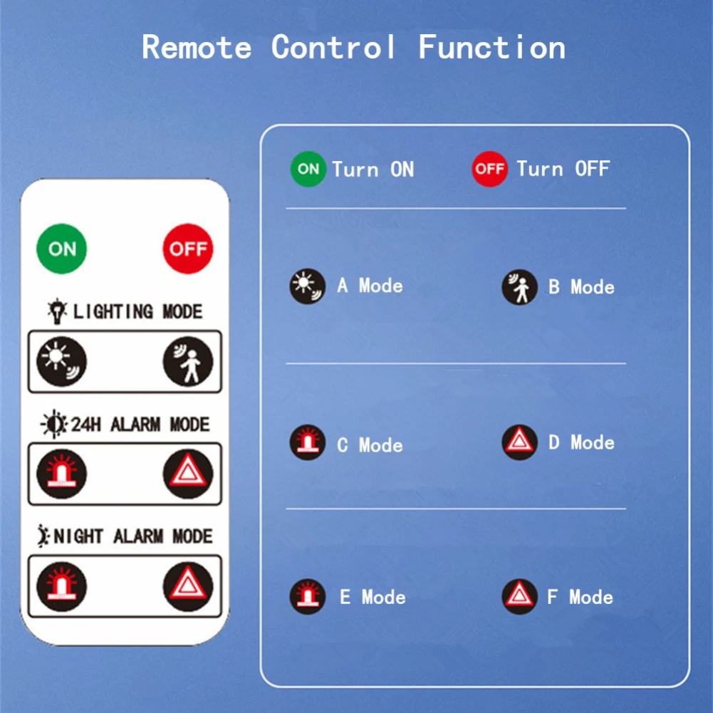 6 modes: wall light control mode (light is always on), lighting time more than 8H; wall light human body induction mode: human body induction high bright low light long bright, when someone passes by, the high bright light is induced for 15 seconds, and the light is slightly bright when no one is there; Infrared flashing: the lamp has a built-in sensor, and when a person or animal is detected, the bright spot will flash red and an alarm will sound.
