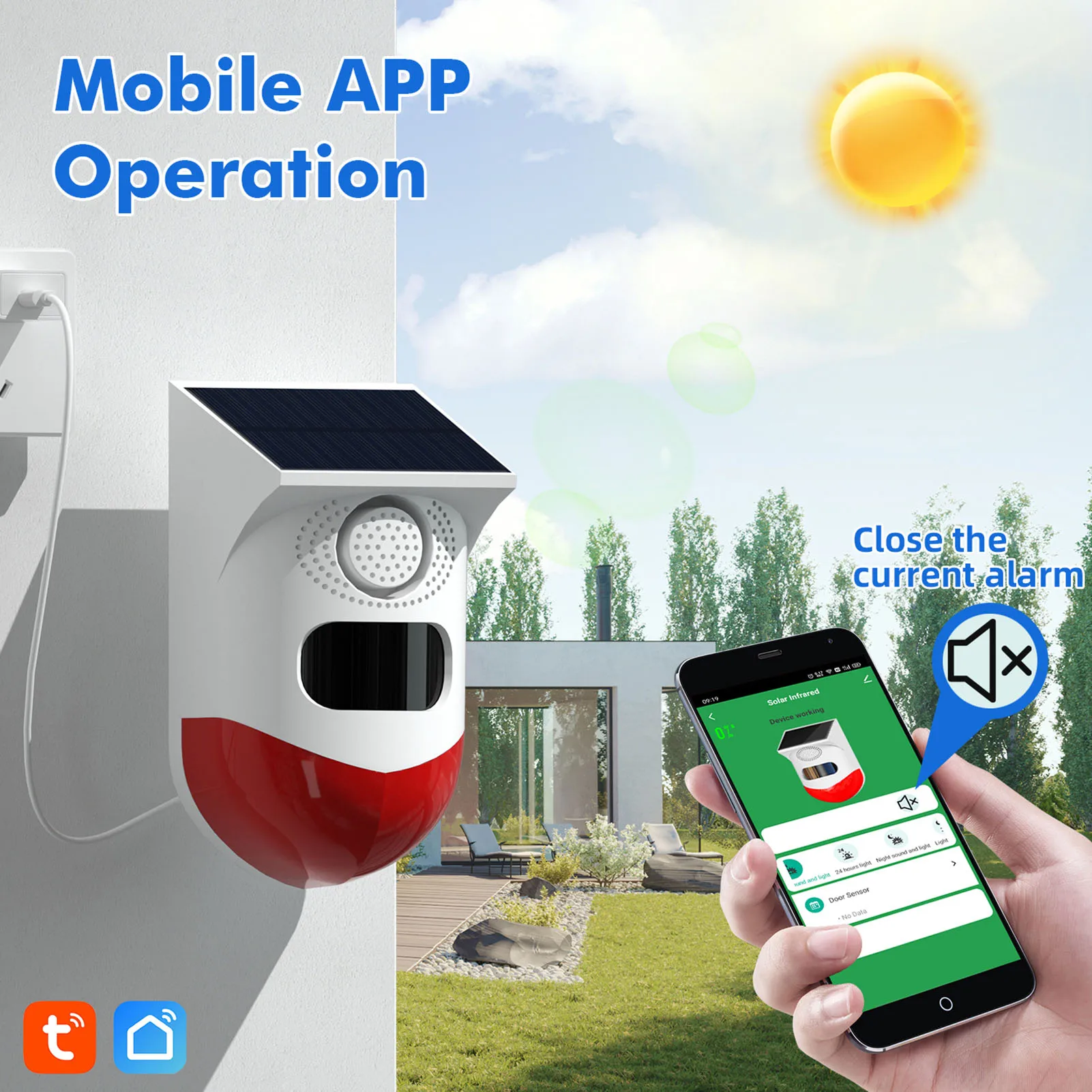 * New type of Tuya WiFi solar powered outdoor strobe siren with sound and light alarm function, no electricity cost, energy-saving, eco-friendly and safe for your family.
