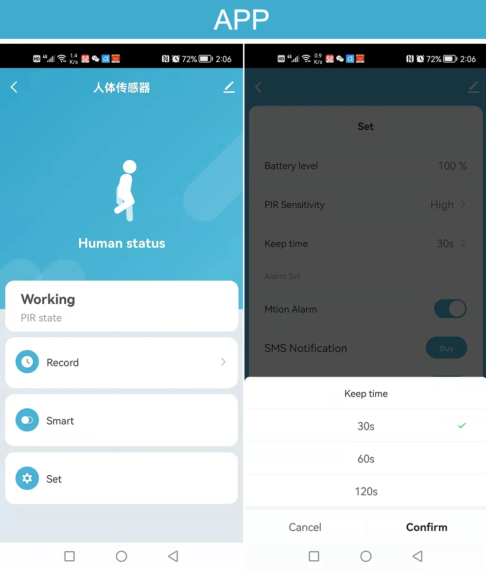When the device perceives human movement within the detection range, it will transmit the information to the cloud through the gateway, and you can receive real-time alarm pushes on the App. wherever you are, and you will be in control of the movement.