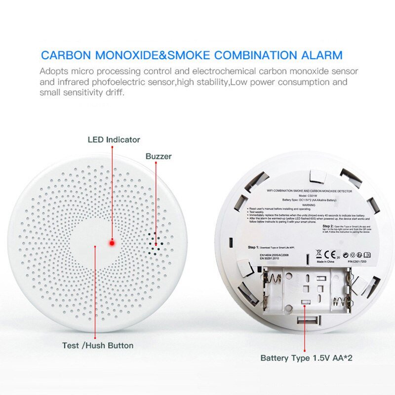 This product is a smart carbon monoxide and smoke combo detector, adopting microprocessor control. The electrochemical carbon monoxide sensor is stable and reliable with low current consumption and small sensitivity drift.