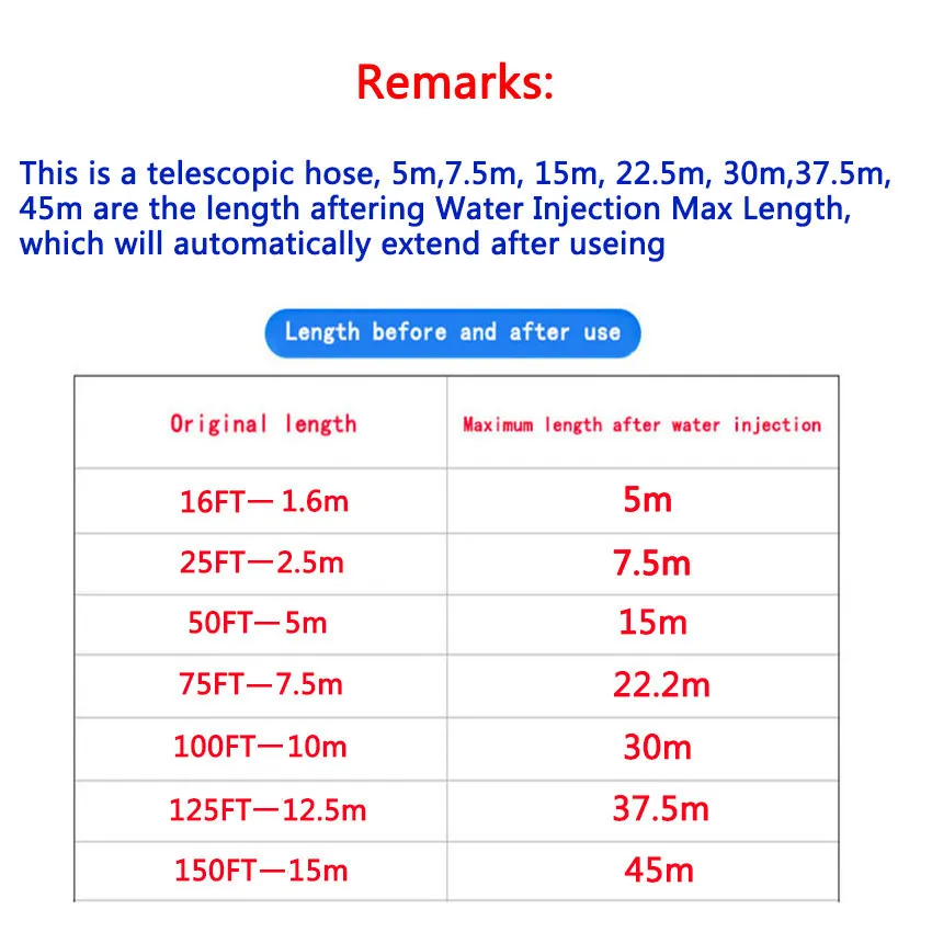 - 25ft: Original length is 2.5m, After extend is 7.5m