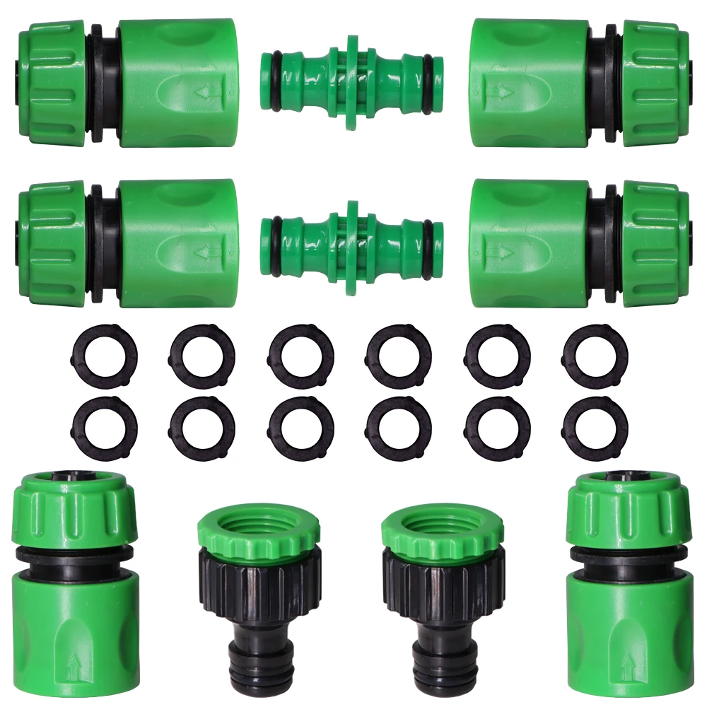 A kit includes: 6 x 1/2” hose quick connectors; 2 x 16mm equal nipple joints; 12 x rubber rings; 2 x 1/2” & 3/4” female tap connectors.