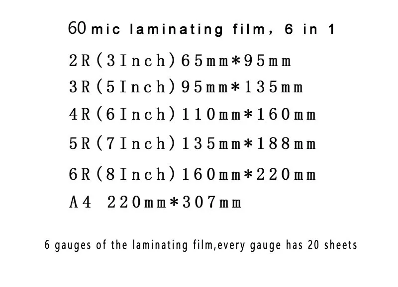 60 mic, 6 Sizes ( 3" 5" 6" 7" 8" & A4) Thermal Laminating Film, PET+EVA, 20 Sheets/Each Size, 120 Pcs/Pack For Roll Laminator