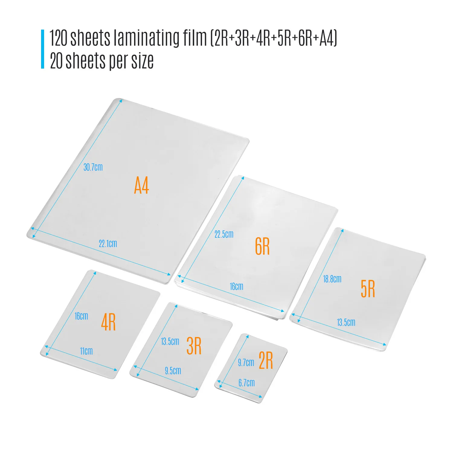 Total 100 sheets laminating film, 10 sheets per size for (2R/3R/4R/5R/6R), 50 sheets for A4 size.