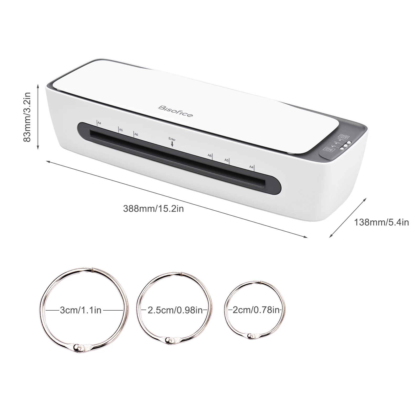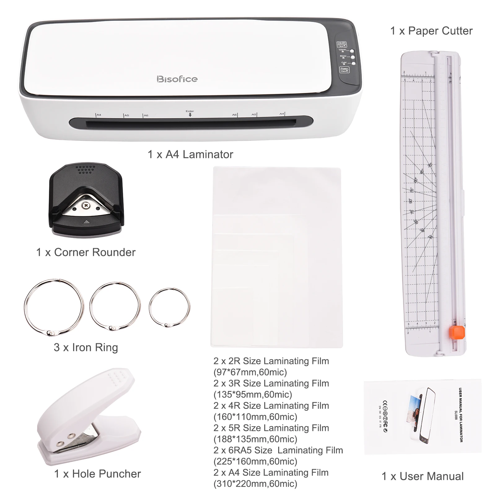 6 in 1 MULTIFUNCTIONAL: SL688 laminator comes with 6 functions to meet your needs which including hot laminating and cold laminating, paper cutter, corner rounder, hole puncher and Hoop Binding, you can enjoy all convenience  in this one laminator set. With 230mm/9 inches entry width, fit for A4/A5/A6 size paper which meets all your needs.