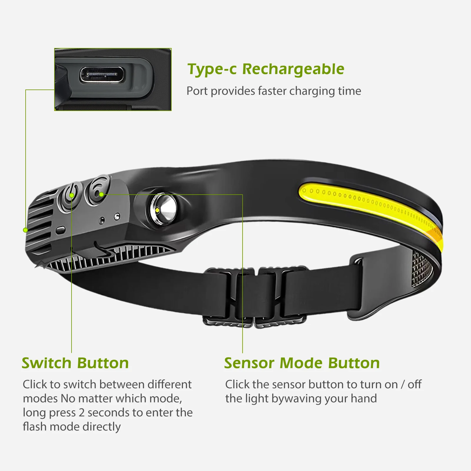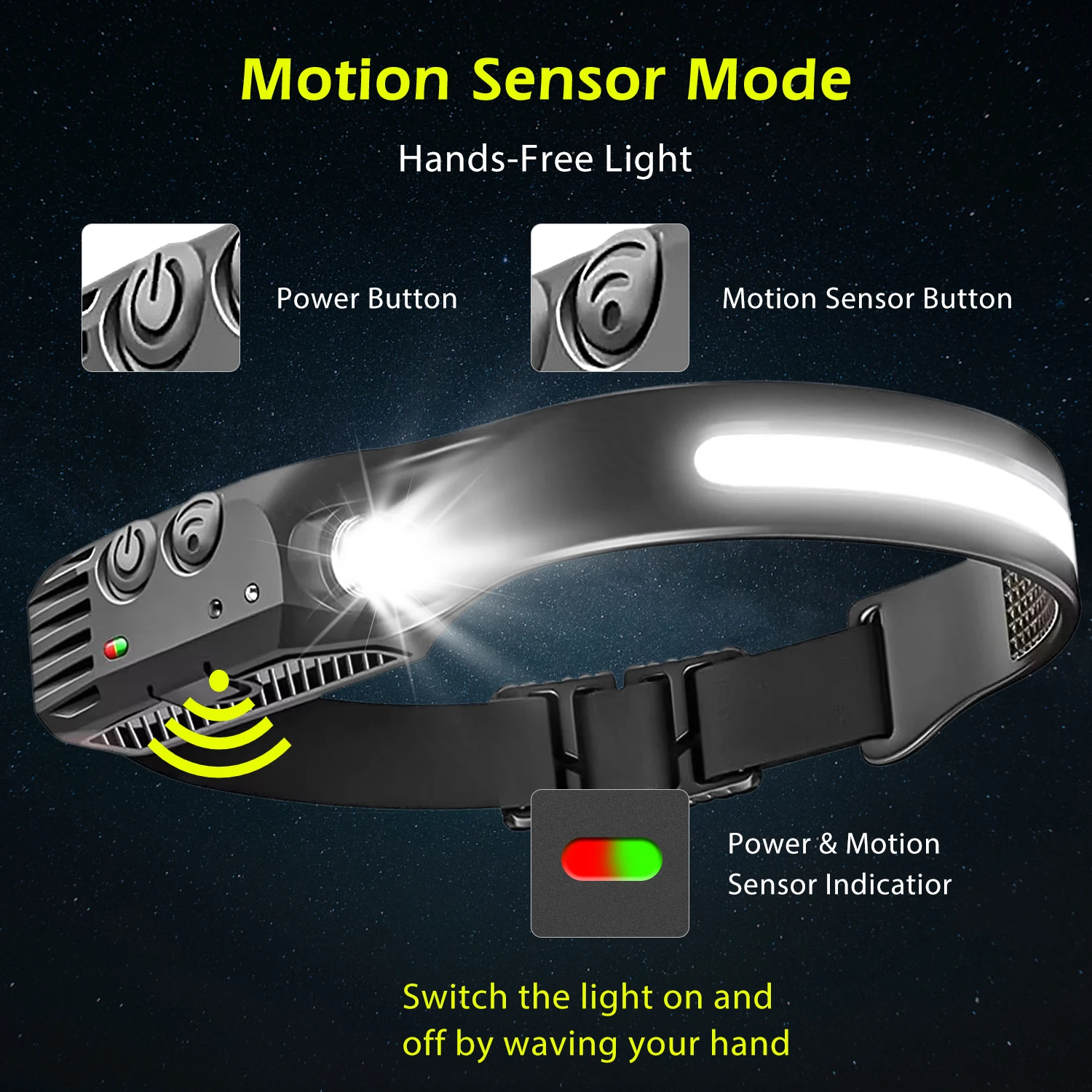 【MOTION SENSOR MODE】 – LED Headlamp Camping Accessories is equipped with the latest intelligent sensors. Even if wearing gloves, as long as the distance from the device is within 10 cm, you can quickly switch the ON/OFF by waving your hand in motion mode.