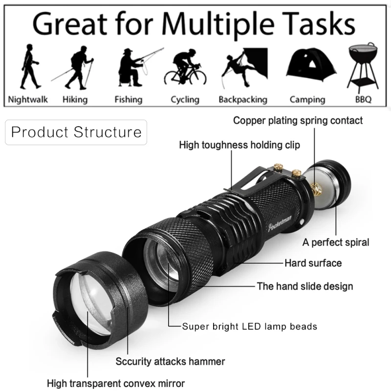 • Handhold Flashlight: Portable, Zoomable, Waterproof