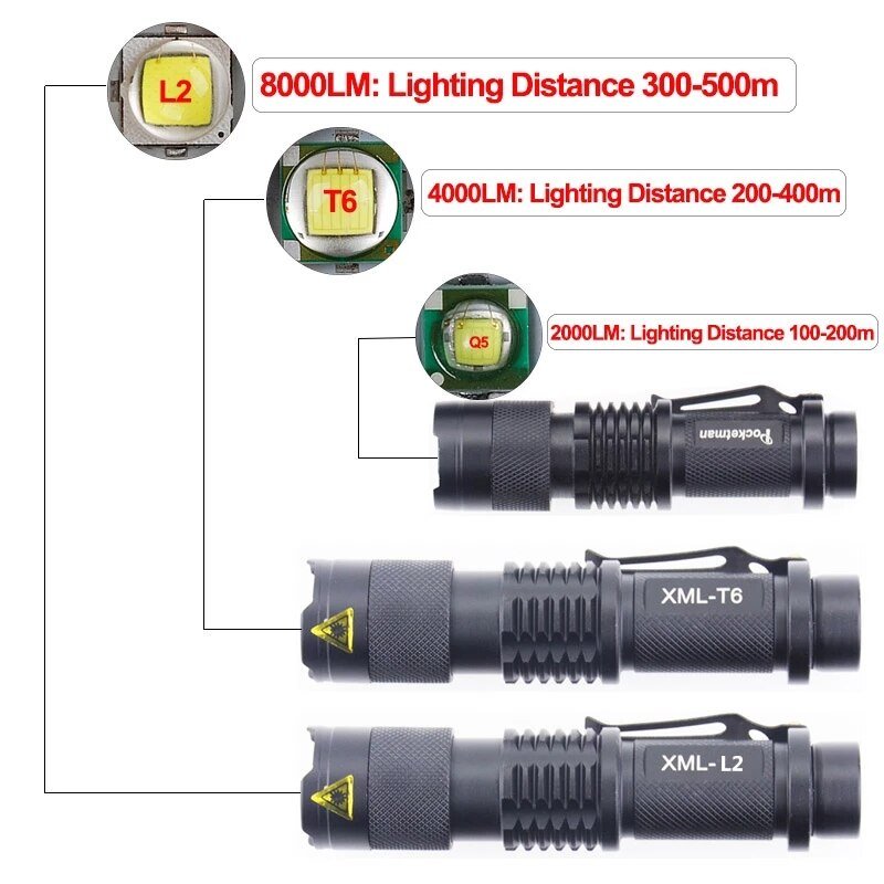 • LED Emitter: Q5 2000LM    T6 4000LM   L2 80000LM