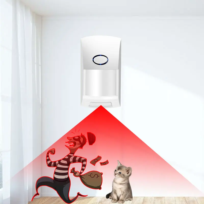 This device mainly used indoors adopts infrared detection + intelligent volume recognition technology to effectively prevent pet interference and false positives. It is principally paired to use with the alarm host via wireless 433MHZ signal. When the device detects an intruder, it immediately transmits the wireless 433MHZ signal to the alarm host so that the host immediately transmits alarm information after receiving the immediate transmission.