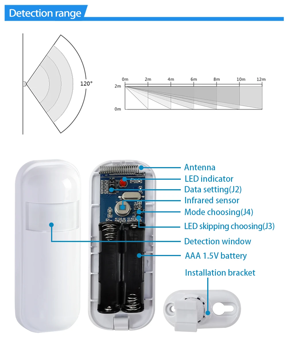 Detection distance up to 12 meters, detection angle 120°