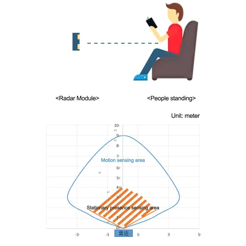 5. If the tested person is sitting with their back to the radar, the sensing effect will decrease. Because when facing the radar with the back, the fluctuations in the chest or abdomen caused by breathing cannot be detected. •