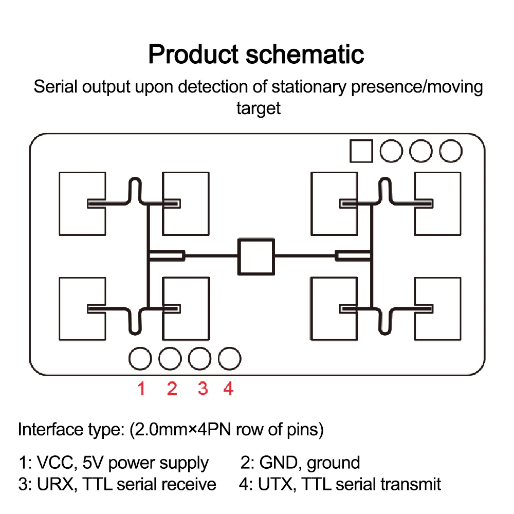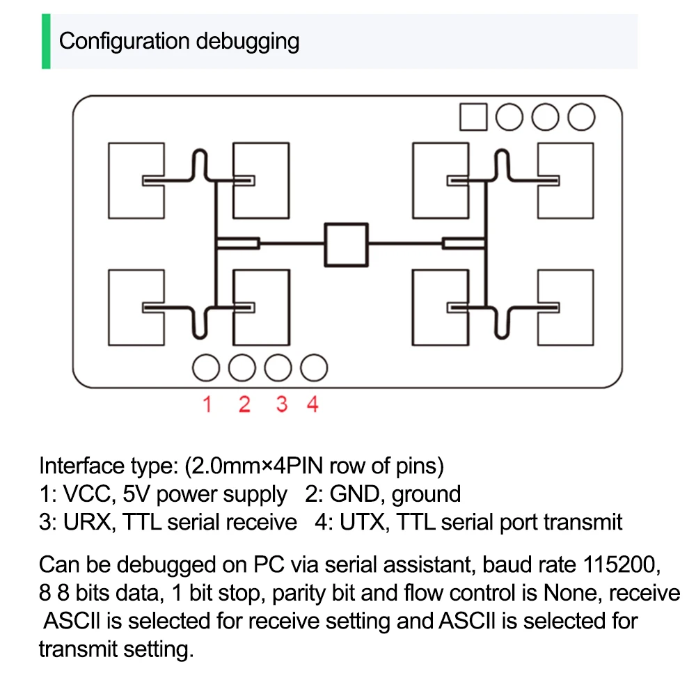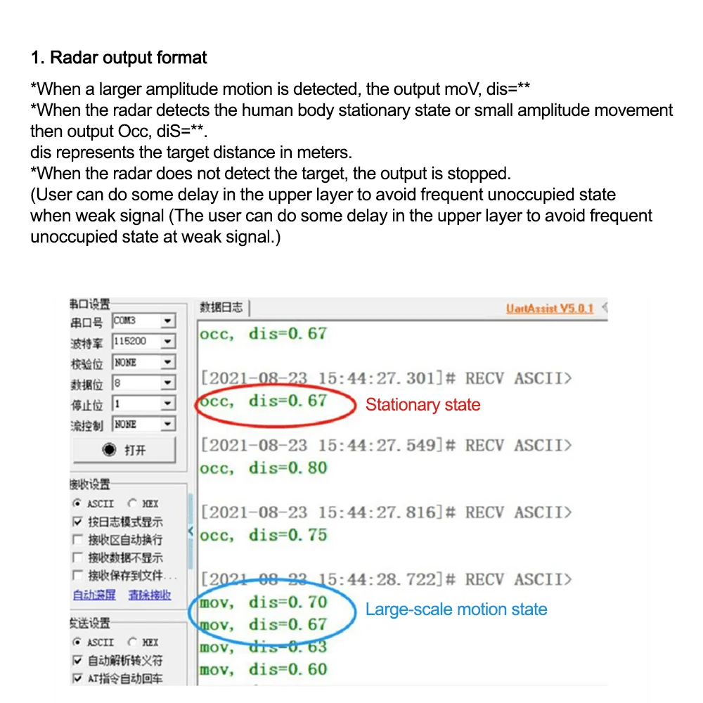 4. The module is used for detecting human movement and presence, so the distance value provided is not an accurate distance measurement, only indicating the approximate distance of the target. •