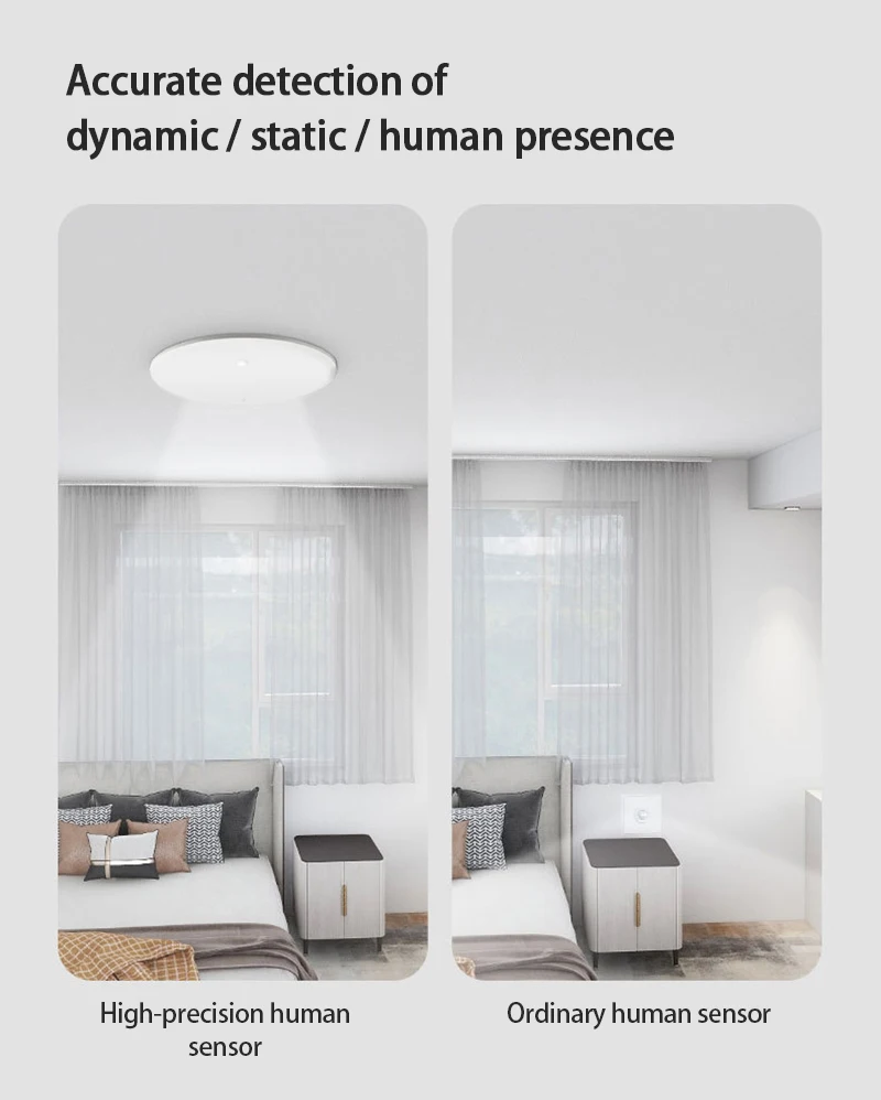 This product solves the pain points that traditional human sensors cannot detect the presence of a static human body. Using advanced infrared technology, it can accurately detect whether there are people in the area, whether it is active or static.