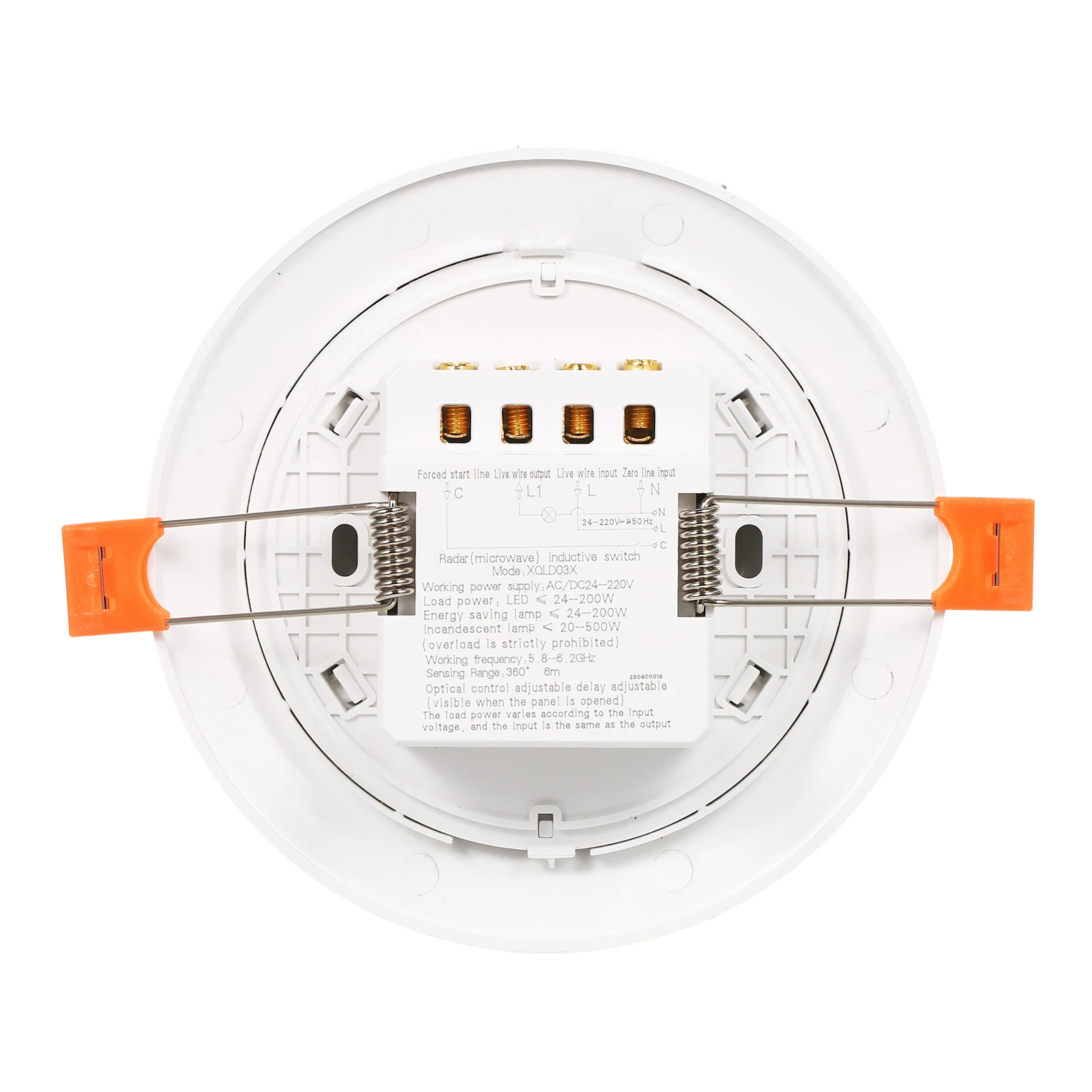 Ceiling mounted motion sensor features 360 degree detection with 6 meter sensing range; Radar waves are capable of penetrating glass, paper, plastic and thin wall.