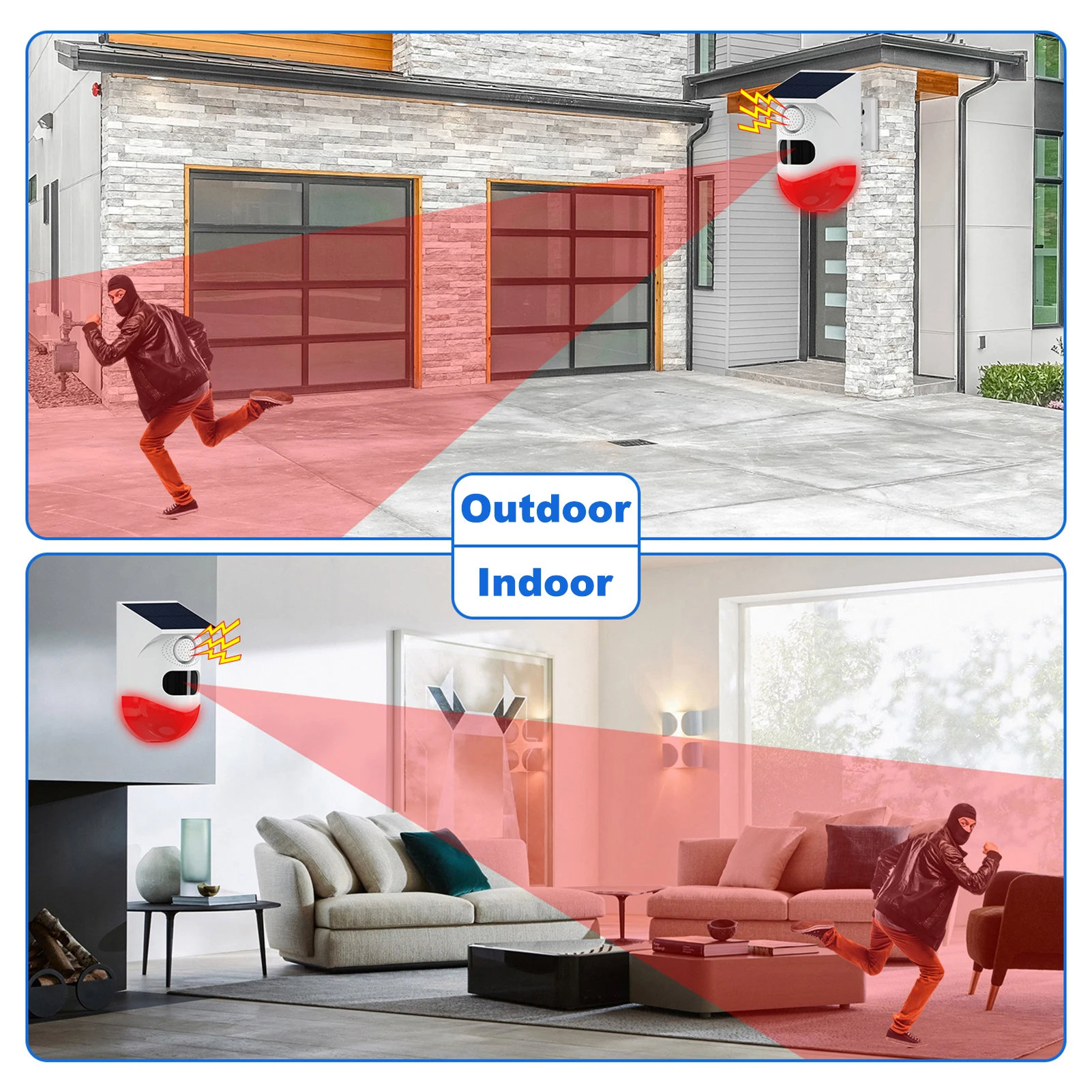 Solar Energy Alarm Light: this solar alarm strobe light can frighten away intruders and thieves by siren and strobe light. Built-in LED lights enable long-distance visibility.